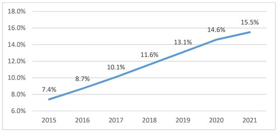 E-commerce share of total global retail sales from 2015 to 2021 (source: [7]).
