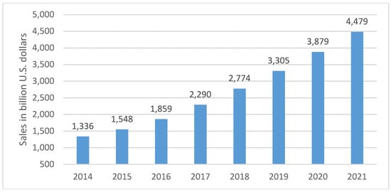 Retail e-commerce sales worldwide from 2014 to 2021 (source: [8]).