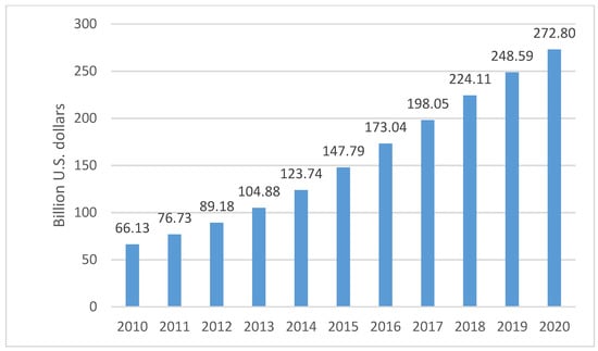 The following years saw the Internet entering the Web 2.0 phase and dynamically developing social media, which were increasingly used for advertising purposes [14]. As a result, in 2010, global spending on on-line advertising exceeded USD 66 billion, and, in 2020, it is expected to reach the level of nearly USD 273 billion (Figure 3).