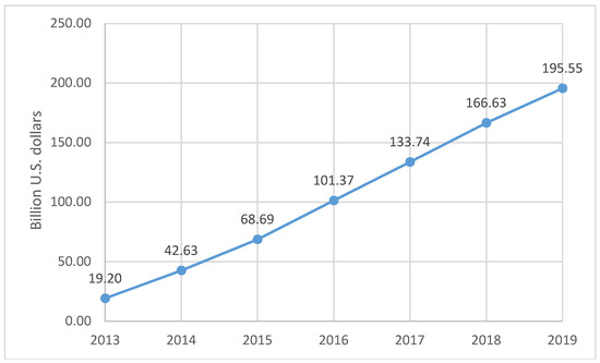 At the same time, over the last few years, the widespread use of mobile devices—particularly smartphones, when it comes to access to the Internet and on-line shopping—has become a factor which has greatly influenced the dynamic of spending on digital advertising [16]. Because of this trend, companies allocate increasingly higher amounts of money spent on digital advertising in mobile advertising (Figure 4). In 2019, the spending is to reach the level of over USD 195 billion, and the dynamics of their growth between 2013 and 2019 is to reach 430%. It should also be noted that in the USA, for example, the mobile advertising revenue already accounted for 50.52% of the total revenue from digital advertising in 2016 [15].