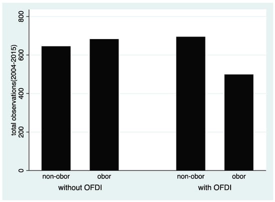 This paper further analyzes the characteristics of firms investing in OBOR countries. Firms that are actively investing in OBOR countries are generally those that are facing fierce domestic competition and eagerly seeking outlets for their excess productivity [4]. One motivation behind the BRI was the urgent need for industrial structural upgrading especially for industries that had surplus capacity in China such as infrastructure construction. When Chinese domestic markets reached saturation, many firms began to experience profitability and productivity decreases. Based on existing literature, the relationship between FDI and firm labor productivity is found to be highly connected. Generally, OFDI promotes parent firm’s labor productivity and total factor productivity through reverse technology spillover effect. In addition, scholars also explained that firms with higher productivity will take more FDI actions [37,38,39].