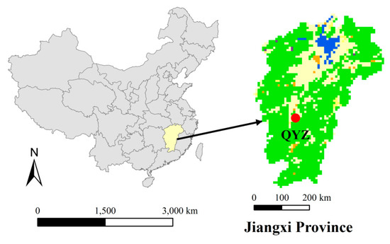 The location of the study site. The green areas represent forests. The red solid circle represents the Qianyanzhou (QYZ) Ecological Station.