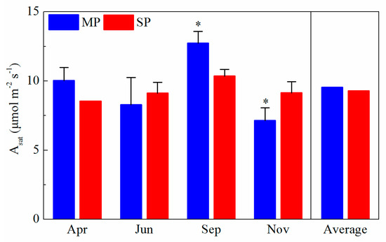 There exist significant differences in the Asat values of MP and SP (p < 0.001) in September and November (p < 0.05) (Figure 2). However, there was no significant difference in the average Asat values between MP (9.54 μmol m−2 s−1) and SP (9.28 μmol m−2 s−1) (p > 0.05) during the experimental period. The Asat values were higher in MP than in SP in April and September. The maxima of Asat occurred in September for both species, with the value of 12.73 μmol m−2 s−1 and 10.34 μmol m−2 s−1 (Figure 2).
