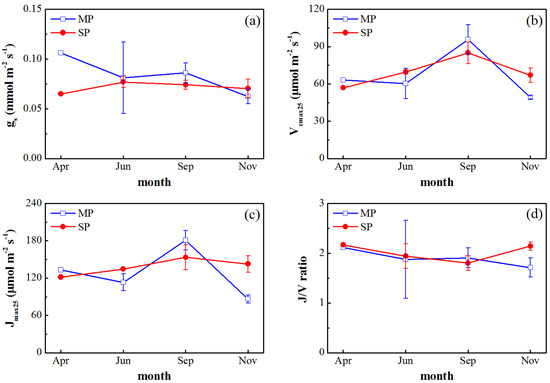 Seasonal patterns in (a) gs, (b) Vcmax25, (c) Jmax25, and (d) J/V ratio, ±SD, for MP (blue line) and SP (red line) during the experimental period (April, June, September, and November). Each value represents the average of the total measured data for three days or for one day (only SP in April).