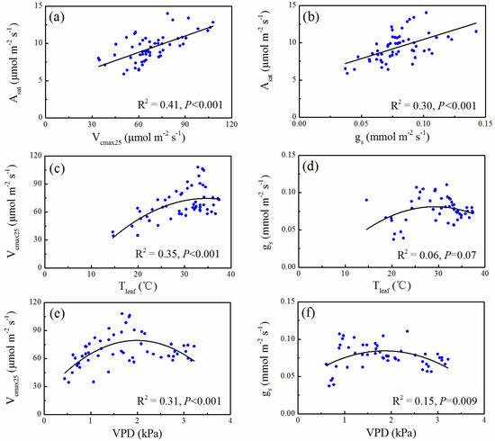 There were significant positive correlations between photosynthetic rate and both stomatal conductance and biochemical parameter (Vcmax25) (p < 0.001) (Figure 4a,b) for both species. The correlation between biochemical parameter and photosynthetic rate (R2 = 0.41) was larger than the correlation between stomatal conductance and photosynthetic rate (R2 = 0.30) (Figure 4a,b). The effect of leaf temperature on Vcmax25 was significant (R2 = 0.35, p < 0.001), but there was no significant correlation between leaf temperature and gs (p > 0.05) (Figure 4c,d). VPD had significant effects on both biochemical parameter and stomatal conductance (R2 = 0.31, p < 0.001 and R2 = 0.15, p = 0.009) (Figure 4e,f).