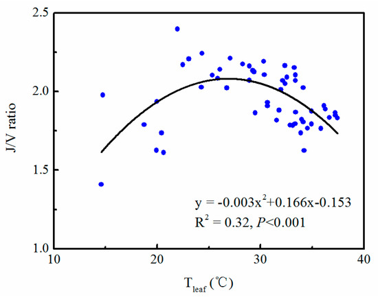 In our study, J/V ratio was not constant at seasonal scale (Figure 3d), which was significantly correlated with leaf temperature (Figure 5). The J/V ratio increased with leaf temperature, and then decreased as the leaf temperature continued to rise (Figure 5). J/V ratio reached its maximum at the leaf temperature of 27.27 °C during the experimental period. The highest point of the nonlinear fitting curve was 2.14 (Figure 5).