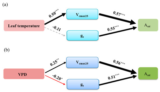 Structural equation models of the effects of stomatal and biochemical parameters on Asat in response to (a) leaf temperature and (b) VPD in subtropical evergreen coniferous plantation. The bold numbers indicate the standard path coefficients. The grey dashed arrows indicate nonsignificant pathways, and the red and black arrows represent significant negative and positive pathways, respectively. The arrow width represents the strength of the relationship. * p < 0.05; ** p < 0.01; and *** p < 0.001. (a) RMSEA = 0.00, χ2 = 0.61, p = 0.44, (b) RMSEA = 0.00, χ2 = 0.39, p = 0.53.