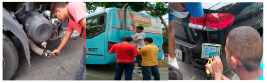 The instrument of measurement used for vehicular sources was the exhaust gas analyzer for engines, BRIDGE MODEL 900403. This analyzer uses a proven methodology for the measurement of gases, NDIR (Non Dispersive Infra-Red) for the gases CO, HC, and CO2, and electrochemical sensors for measuring O2 and NOx. The collection of data for vehicular sources was carried out for three consecutive days during November 2012. This study made use only of data for CO and NO2. The Figure 8 shows photographic records of the measurements made.