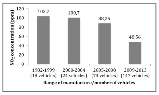 Direct NO2 emissions from vehicular sources were grouped according to the corresponding year of manufacture of each vehicle. The results indicate that average NO2 concentration was 89.01 ppm (Figure 9).