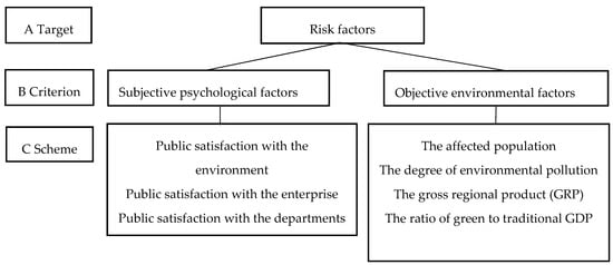 The identification of risk factors of environmental conflict is the initial stage of risk assessment and the basis of the whole risk assessment stage []. It is related to the reliability and authenticity of the evaluation stage. In the early phase, environmental conflicts are the environmental problems of individual group events. Various factors in the complex social background evolved into multi-factor environmental group events. Therefore, environmental conflicts must be placed in the real social stability system. According to a social risk stability study of Li and Zhao, there are six categories in a social risk warning index system []: subsistence security, economic support, social distribution, social control, and social psychology. Li and Zhao noted that subsistence security and economic support were the majority and this represented the lifeblood of controlling social stability in the risk system. Once the social stability structure is broken, the scope of this influence will gradually expand. As Barrow noted, people cannot feel the impact of social instability until it really exists []. The environmental conflict should draw on the social risk stability early warning index system in the selection of risk factors. The social psychological indicators can map other system indexes from objective reality and emotional levels. As evidenced by Iojă, environmental conflict is a subjective social process []. Therefore, social psychology is divided into subjective factors and objective factors to select environmental conflict risk factors.