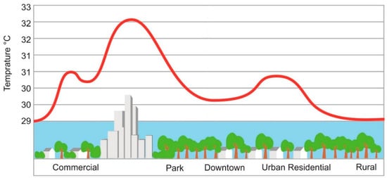 In the next decades, the globally observed temperature trends will exacerbate warming especially in urban areas [,]. The increase in temperatures causes a greater vulnerability of common road pavements (with surface layer composed of asphalt concrete) and rail (track), increases the energy demand to operate buses, especially for auxiliaries [], which is perceived by the fleets managers as one more items in the overall lists of operational costs [,], and worsens the public’s living conditions. The urban heat island (UHI) related to extreme heat events (EHE) is caused by the urban development, which has reduced natural surfaces, constructing impermeable and large obstacles []. Indeed, buildings absorb heat during the day and release it during the night, moreover they hinder the wind circulation (Figure 1).