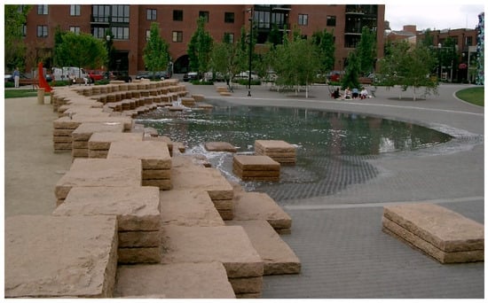 UGI, cool and permeable pavements are not effective in very hot climates, where passive countermeasure versus UHI should be adopted to improve the life of citizens. An example are the air-conditioned bus stops constructed by the Roads and Transport Authority (RTA) in 15 districts across the Emirate of Dubai []. In Dehli, people may wait the bus staying in a fresh environment: Fresh air chambers have been installed to improve the service life of bus users and pedestrians []. In the city of city of Chongqing (China), a hydraulic system sprays cool water to waiting bus passengers []. Wading pools offer refreshing opportunity to citizens (an example is Jamison Square Fountain in Portland, Figure 3).