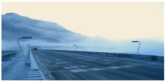 In addition to the gradual rise of average temperature, climatic variability and extremization shall be considered: E.g., during the last years in several States, heavy snowfalls have unexpectedly occurred and damaged the traffic system. Under the circumstances of the climate changes occurring throughout the world, in the last decades, winter season hazards have grown in many areas []. It is therefore critical studying the impact of cold winters on road services. The most important weather parameters to be considered are: Daily minimum temperature; daily sum of precipitation; relative humidity; new snowfall height; existing snow height. The use of anti-freezing agents spreading before snowfall and snowplowing after snowfall requires important and growing efforts [], both economic and operative []. Fixed Automated Spray Technology Systems (FAST), in the areas most subject to the severe cold weathers, automatically spray liquid antifreeze (typically calcium chloride in aqueous solution) when it is needed [,]. Experience gained in North America and Europe gave conflicting results: These systems increase safety of transport but require complex installation and maintenance procedures [] (Figure 4).