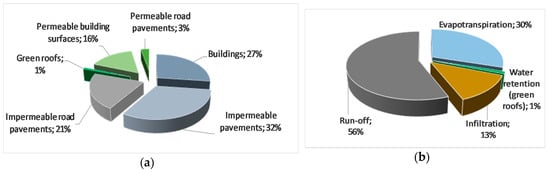 Rain water balance of a quarter in Rome (Data from Reference [], draw by authors). (a) Type of surfaces; (b) water balance.