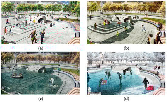Water square conditions (With permission from Author of []). (a) Typical condition; (b) after a heavy rainfall (30 times a year); (c) most severe condition (once a year); (d) when it freezes, it becomes an ice rink.
