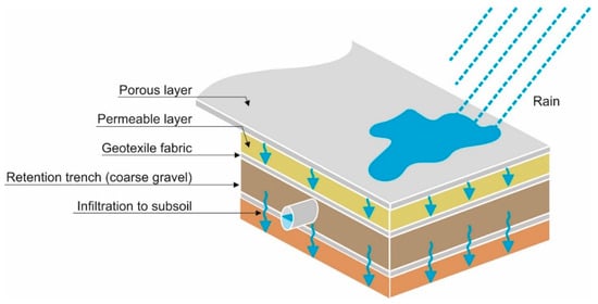 A different approach for road pavement construction leads to the porous pavements (Figure 9), which naturally refill underground aquifers rather than transport polluted storm water to treatment facilities [,].