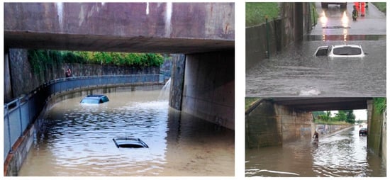 Indeed, underpasses are often susceptible to flooding: Traffic lights prevent the vehicle circulation when the road is flooded. In Italy, the Abruzzo Region started a pilot project to mitigate this water risk for pedestrians and occupants of vehicles. Five road underpasses located in Pescara, Giulianova, Montesilvano, Francavilla al Mare and Tortoreto have piezometric and on/off level capacitive sensors which continuously check whether the critical threshold has been reached and the traffic should be inhibited. The system logic also minimizes the activation time of the alert message, optimizing system performance []. Furthermore, the system has a webcam to monitor the situation in the underpass, from the activation of the alert to its end. Two information panels with a variable message complete the system. These traffic inhibition systems should be operative under any conditions, even when power outages occur: At this scope, they should be provided with emergency generators and/or uninterruptible power supply (UPS) systems. In other cases, water pumps are installed to control the water level and reduce damages caused by flood [,].