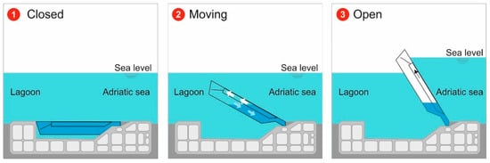 In Italy, the MOSE mobile gates will help to maintain the harbor and other existing activities in the Lagoon of Venice, and protect the historical city from flooding. It is composed of rows of retractable paratroopers placed at the so-called port mouths (the entrances connecting the lagoon with the open sea) of Lido, Malamocco and Chioggia (Figure 11).