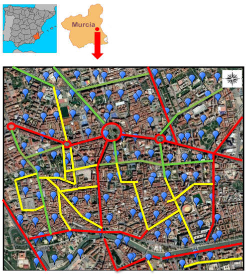 The urban center of the city of Murcia was the area of study. This city might be considered a typical medium-sized European city, with 439,000 inhabitants, and which covers an area slightly greater than 3 km2. Activities related to the services sector and agri-food industry are carried out in the surrounding industrial area.