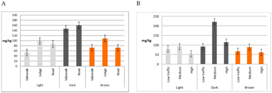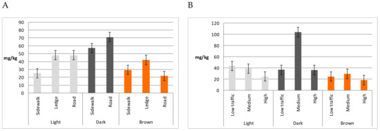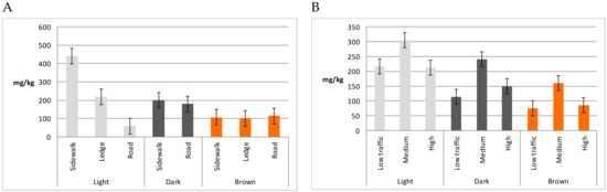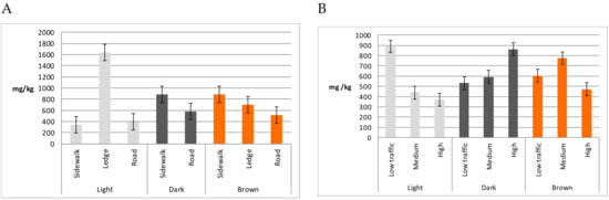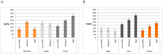 Table S5) differed statistically among the three color categories considered: it was highest in the light-colored dusts and lowest in the dark-colored ones. Nevertheless, though the Zn concentration was homogenous in the sidewalks, ledges, and roads, it differed statistically among the three traffic intensity levels. As shown in