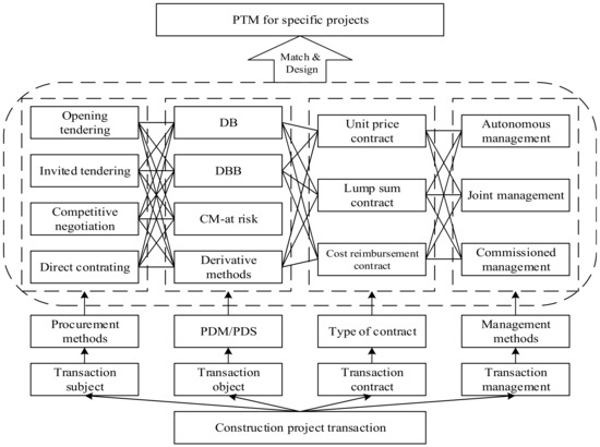 Basic elements of the project transition mode. PTM: project transaction mode; DB: design–build; DBB: design–bid–build; CM: construction management; PDM/PDS: project delivery method/system.