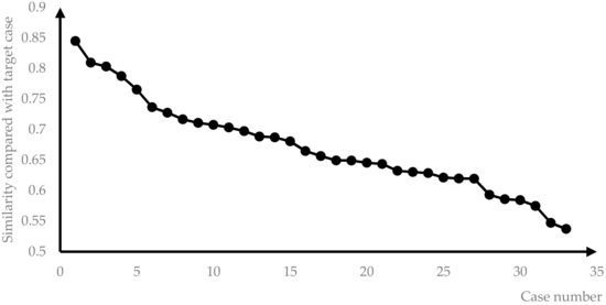 In Equations (1)–(3), CS is the similarity value between the candidate case and the target case, and it is arranged in descending order; and N is the number of output cases; i = 1, 2, … m, where m is the total number of cases in the case library. The similarity value between the output case and the target case must be greater than 60, and also greater than the average similarity value. The number of output cases must be greater than 3. Under the premise of the first two conditions, the similarity difference between the two adjacent cases descending by similarity value is guaranteed to be smaller than the average similarity difference in the previous i cases.