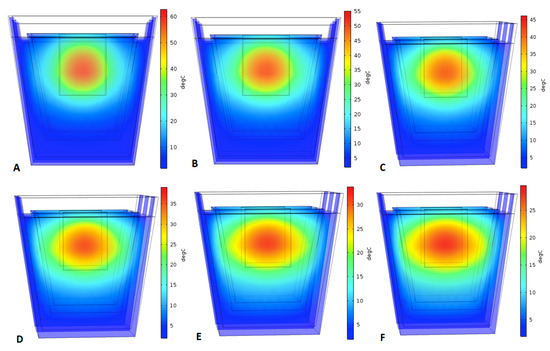 In Figure 3, after 6 h of heating, the process was stopped. Figure 3A shows that the maximum temperature remained at 60 °C; however, the four-dimensional conductive contours expanded with the passage of time, and it can be seen by the contours that the temperature near the boundary of the inner pot reached 20 °C. Figure 3B shows that the temperature decreased from 60 °C to 55 °C, but the expanding heat transfer pattern is well-defined and moving in all directions. The decreasing temperature trend continued in Figure 3C, reaching 45 °C. Figure 3D clearly illustrates the declining temperature of the central zone, which decreased to 35 °C; however, the heat transfer contours continued to expand. Figure 3E shows that the temperature of the central zone decreased to 30 °C. The increasing horizontal heat transfer is shown in all images in Figure 3, which illustrates heat loss from above. However, no heat can be seen from the sides due to the insulation; this transfer only crosses the boundaries of the inner pot. The maximum temperature observed in Figure 3A was 60 °C and the minimum temperature observed was 25 °C.