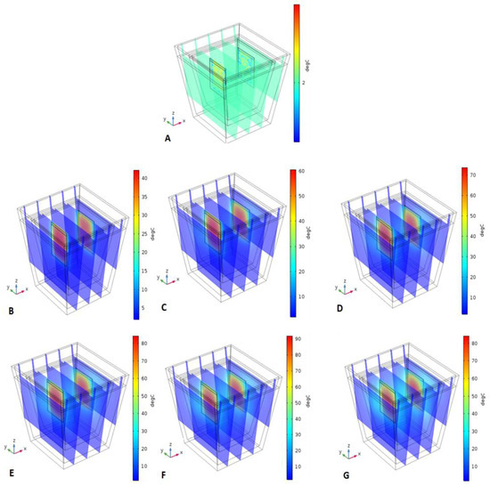 The simulation results are shown in Figure 2. Before the heating system was initiated, the set ambient temperature was 2 °C, as shown in Figure 2A. After 1 h of heating, the temperature increased and reached a maximum of 11 °C, as shown in Figure 2B. Figure 2C illustrates that the temperature of the central zone which increased to 25 °C, and the temperature increasing trend can be observed in Figure 2D, which has a maximum temperature of 40 °C. The increasing temperature trend continued and after 4 h of heating the temperature reached 50 °C, as shown in Figure 2E. In Figure 2F, the maximum obtained temperature was 60 °C. After this, the heating source was switched off and it can be seen that in Figure 2G the maximum temperature remained the same as that in Figure 2F. All images in Figure 2 illustrate the continuous increasing temperature trend of the temperature profile and it can be observed that the heat flux expands in all directions through the pot over time.