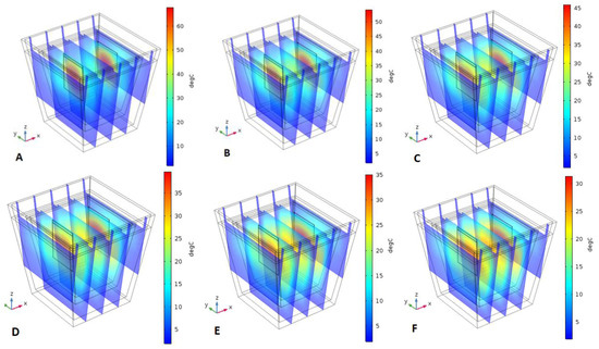 The simulation results of conductive surface heat transfer during the first 6 h of heating are shown in Figure 4; the temperature variations and increasing surface heat transfer pattern can be observed in all of the images. The initial set ambient temperature of the heating system was 2 °C, as shown in Figure 4A. After 1 h of heating, the maximum surface temperature increased and reached a maximum of 40 °C near the heating source, as shown in Figure 4B. The central slice temperature range also increased from 5 °C to 10 °C. In Figure 4C, the temperature of the heating source zone increased to 60 °C and the temperature range of the central slice was 10 °C to 15 °C. The surface temperature trend can be observed in Figure 4D, which had a maximum temperature of 70 °C near the heating sources, and the central slice temperature range increased from 15 °C to 20 °C. Figure 4E shows that the temperature range near the heating source was 70 °C to 80 °C, and the central slice temperature range was 30 °C to 40 °C. This pattern of increase continues in Figure 4F, where the maximum temperature detected was 90 °C and the central slice range was 35 °C to 45 °C. Figure 4F shows that the rate of heat transfer was reduced, as the temperature in the heating source slice dropped from 90 °C to 80 °C and the contour was lengthened.