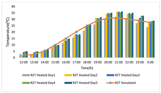 Figure 6 presents a comparison of the heat transfer rate of the simulated and experimental RZTs at different times over the five days. For the first observation at 12:00 p.m., the simulated RZT was less than all of the experimental RZTs for that time; the maximum temperature in heated pots noted was 5 °C on day 5, whereas the simulation reading temperature was 2 °C. After 1 hour, the experimental RZTs showed a small decrease in all of the heated pots; however, the simulated temperature increased from 2 °C to 2.5 °C and the experimental RZT changed from 2.8 °C to 2.5 on day 1, from 2.1 °C to 2.6 °C on day 2, from 4.3 °C to 4.1 °C on day 3, from 4.9 °C to 4.7 °C on day 4, and from 5 °C to 4.9 °C on day 5. At 2:00 p.m. the simulated RZT was 5.4 °C; at this time, a slight fluctuation was observed in the experimental RZT readings for all five days, which ranged between 4.14 °C and 6.6 °C. The increasing experimental RZT trend also continued at 3:00 p.m. on all days; at this time, the simulated RZT rose from 5.3 °C to 9.9 °C and in heated pots the experimental RZT was between 7.9 °C and 9.9 °C. At 4:00 p.m., the readings of the RZT continued to rise for both methods, from 9.9 °C to 15 °C in the simulated RZT, while the experimental RZT in the heated pots increased on all days, ranging between 11.4 °C and 14.4 °C, as can be seen in Figure 6. At 6:00 p.m., the heating power source was switched off in both the simulated and heated pots. After switching off, the RZT increased continuously in both methods as the conduction process kept expanding throughout the pots. The increasing RZT trend continued until 8:00 p.m. in the simulated method, while in the heated pots this increasing trend continued until 9:00 p.m. For the simulated method, the maximum observed temperature was 31 °C, observed at the 10:00 p.m., while the minimum temperature was 2 °C at 12:00 p.m. The dropping trend of the RZT in the heated pots started at 10:00 p.m., with an average drop of 1 °C being observed during this time. At the last observation of heated pots at 12:00 a.m., the RZT ranged between 24 °C and 29 °C.