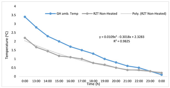 Figure 7 shows that with the decrease in ambient temperature of the greenhouse, the root zone temperature of the non-heated pots also decreased. It can be observed that at 12:00 p.m., the ambient temperature of the greenhouse was 3.5 °C and the temperature of the non-heated root zone was 2.3 °C, which was lower than the ambient temperature. After 1 hour, the ambient temperature decreased to 2.6 °C; at that time, the root zone temperature of non-heated pots dropped to 1.5 °C. The ambient temperature continued to decrease at 2:00 p.m., which affected the non-heated root zone temperature, which dropped to 1.4 °C. At 3:00 p.m., the ambient temperature reached 2 °C and the root zone temperature of the non-heated pot was 1.7 °C. This decreasing trend continued in both the ambient temperature and the non-heated pot temperature until 12:00 a.m. At the time of the last observation, the ambient temperature decreased to 0.2 °C and the non-heated root zone temperature was 0 °C. The temperature dropping trend line can be observed for both ambient temperature and non-heated pot temperature, showing the non-heated pot temperature to be directly proportional to the greenhouse ambient temperature. These results were in good agreement with the study of Abdel Rahman et al. [6], who stated that with changing the temperatures, even in relatively small containers, the root temperature lags behind the air temperature considerably.