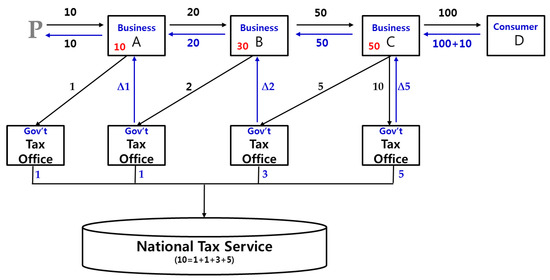 The current VAT operates on a taxation system in which sellers or vendors collect VAT in addition to the price of the goods or services provided to buyers [4]. VAT in South Korea is supported by an invoicing method (i.e., invoice credit method) where the tax amount due is calculated by deducting the input tax from the output tax [1]. However, limitations imposed on the VAT system by the invoicing method as such has led to the prevalence of missing trader intra-community (MTIC) fraud where firms file for bankruptcy after reclaiming the input tax without paying the output tax, and black-market fraud in which VAT is evaded by means of actual transactions without records such as credit card or cash receipts [1,3,5,6]. The VAT collection system is generally divided into two types. First, in Korea, the final VAT has the form of subtracting the input VAT from the output VAT. At this time, the input VAT becomes the seller’s output VAT in the immediately preceding transaction step. Second, as with some European countries, the final VAT is the output VAT and later the input VAT is the return from the tax authority. In short, the above two ways to determine the final VAT are the difference between gross or net approach. In the case of the gross approach, additional VAT and refundable VAT exist at the same time, but when the net approach is applied, only one additional or refundable VAT exists. However, in both of the above forms, deductible and return are all possible in the normal state of the supply chain. If any one trader in the trade chain evades tax, deductible or return becomes impossible. Therefore, the cases presented in this study are notions that apply in most countries.