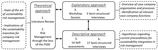 As the first step, a literature review was conducted with the purpose of mapping existing research in relation to theories, tools, and concepts for sustainability integration in risk management. These findings were then used to identify relevant themes, gaps, and hypotheses to be further investigated in the following steps and to derive a first set of questions for the exploratory interviews []. As sustainability risk management is a young and rather immature area, which is not extensively researched, the literature review started with an exploratory approach, as recommended by Karlsson et al. [].