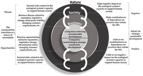 Nature, society, and business are nested, interdependent systems in which the sustainability transition is a source of uncertainty. The effect of this uncertainty on company objectives (left side) is dependent on the company’s contribution or counteraction to strategic sustainable development (right side).