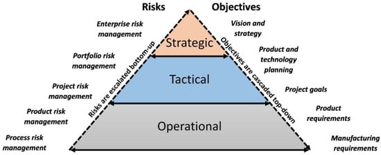 As objectives, which are subject to uncertainty, exist on all levels of a company, here referred to as the strategic, tactical, and operational levels, so also does risk. Bertoni [] defined the three levels as follows: the strategic level is about long-term decisions made by top managers, including the definition of corporate strategic goals. The tactical level is concerned with the management of the corporate material and immaterial resources and the development of a roadmap, based on the strategic goals. It also includes the matching of strategies with specific targets of lower-level departments. The operational level includes the specific procedures and processes on the lowest levels of the organizational hierarchy. As a result, sub-disciplines of risk management have evolved, such as enterprise risk management (ERM) at the strategic level, portfolio risk management at the tactical level, and project- and product risk management at the operational level. The ISO 31000 standard aimed to create coherence and integration between these different sub-disciplines across the organizational levels of decision-making. A review of the literature by Oehmen et al. [], however, found that such integration and interaction is lacking and that no agreement exists regarding the establishment of objectives, which by definition are the foundation for risk management.