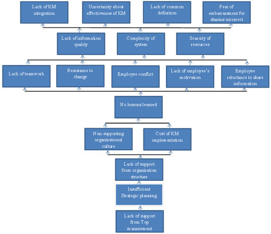Many researchers identified barriers to KM in different areas. Schwartz and Cohn [30] identified a lack of leadership and process innovation as the main barriers to successful KM implementation. Lee and Choi [31] stated a lack of trust among the staff as a key barrier to KM implementation. Singh et al. [32] revealed nine barriers to KM including organizational culture, leadership, strategic planning, knowledge resources, financial resources, technological infrastructure, innovation and knowledge creation, integration of system and knowledge capture. Leadership was the most critical barrier to KM in their study. Robinson [33] addressed lack of time, lack of money, lack of work processes, the resistance of employees, non-supporting organizational culture and poor IT infrastructure as the main barriers to KM. Singh and Kant [34] revealed nine barriers to KM implementation including lack of top management commitment, lack of technological infrastructure, lack of methodology, lack of organizational structure, lack of organizational culture, lack of motivation and reward, staff retirement, lack of ownership of problem and staff defection. Kothari et al. [9] mentioned two main barriers to KM: individual level barriers and organizational level barriers. The barriers at the individual level are employee turnover, information overload, improper training, and lack of motivation. The barriers at the organizational level are organizational structure, taking a long time to implement KM, lack of resources, and employees and KM conflicting goals. The research of Patil and Kant [35] revealed five main barriers, strategic barriers, organizational barriers, technological barriers, cultural barriers, and individual barriers. Among all these barriers, the strategic and organizational barriers were considered the most critical. Hojabri et al. [11] identified seven barriers, organizational culture, unsupportive management, poor information technology infrastructure, lack of knowledge management strategy, lack of performance management, lack of training and education, and lack of process and activities as barriers to KM. Hsiao and Chen [36] found eight hurdles to KM including complexity of technology, compatibility of technology, perceived ease of use of technology, perceived usefulness of KM, the attitude of physicians and staff towards KM, the task uncertainty of individuals, the social influence of the organization, and the organizational support. The attitude of physicians and staff towards KM were considered critical. Karamitri et al. [12] stated four barriers, time restriction, poor information quality, delay in receipt of information and lack of usefulness.