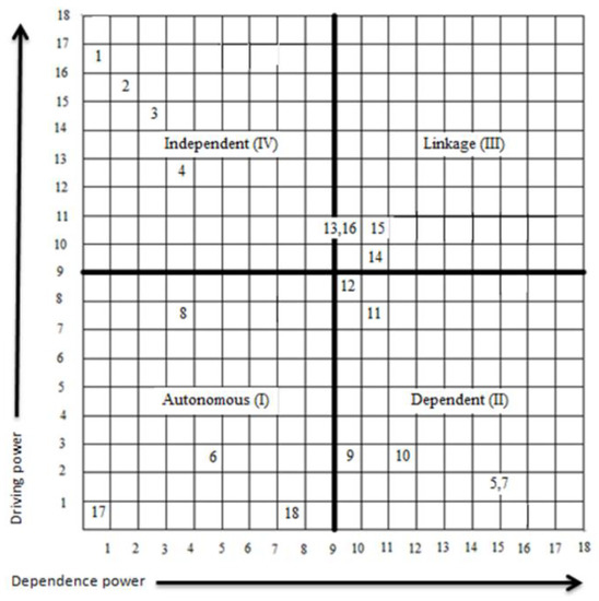 In Table 5, the rows are called the reachability set. When the 1’s in the table are added, it gives the driving power. Driving power of a particular barrier is the number of barriers (including itself) to achieve itself. The columns are called the antecedent set. When the 1’s of the columns are added, they give the dependence number. The dependence number is the barriers that will try to achieve it. The driving and the dependence power are shown in Table 5.