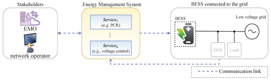 BESS are being used to enhance the power quality and to maintain the power stability, among others. This involves frequency and voltage control, self-consumption, peak-shaving, etc. [3,11,12]. Those functionalities are usually embedded within an external system (e.g., EMS) that controls active and reactive power of the battery to facilitate the referred services. Thereby, a participation of different stakeholders is required, such as network operators, Energy Market Operator (EMO), or Distributed Energy Resources (DER), as outlined in Figure 1. As an example, the UC Primary Control Reserve (PCR) [11] controls the active power of a BESS to support the regulation of the grid frequency. Thereby a communication of the EMS with a smart meter, network operator and a BESS is needed. On the other hand, the UC minimization of costs with peak-shaving [12] would require a communication with a PV generator and households to measure the active power generated and consumed.