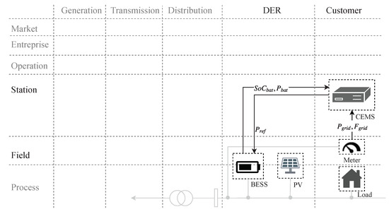 The UC Customer Energy Management System (CEMS) was implemented using EMSOnto as a basis [8]. SGAM is the preferred approach among smart grid specification approaches as demonstrated in [4]. The SGAM information layer represent system’s components as well as their information flows. Moreover, it combines domain-axis and zone-axis to structure smart grid control applications. For the CEMS in this UC, a detailed model is provided as an SGAM description, as seen in Figure 5. This shows the main CEMS’s actors (i.e., BESS, CEMS, Meter, etc.) and the scope of the CEMS, which is located at the customer side and at the station level.