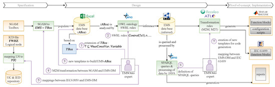 An overview of the work performed by control engineers on the frame of EMSOnto is shown in Figure 2. At the specification phase, engineers study the requirements to be fulfilled by the EMS and starts a rough definition of the behavior and the structure of the EMS control applications. At this stage, different approaches such as SGAM, Unified Modeling Language (UML) and Systems Modeling Language (SysML) for system specification are employed [6,16].