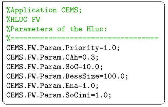 An automatic generation of the MATLAB script shown in Figure 14 is performed. Only the parameters’ values are generated. Other attributes such as format and unit are dismissed. Moreover, a refinement of the code was not necessary and it was used as it was generated. This script supports the proof-of-concept of the CEMS simulated within a MATLAB/Simulink platform [8].