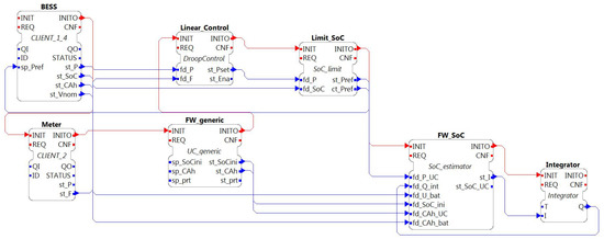 On the other hand, the validated CEMS is transformed into IEC 61499 models, the ensemble of function blocks focused on HLUC() is shown in Figure 15. A refinement of the obtained model consisting on the replacement of function blocks is carried out. Furthermore, two clients simulating the communication with real BESS and meters are generated but not configured ( and ).
