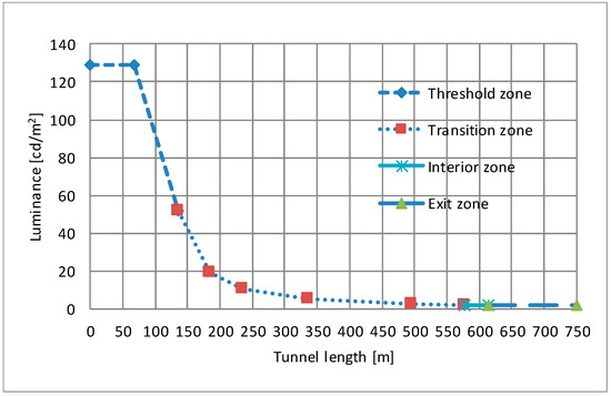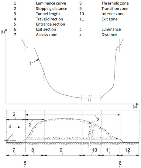 The lighting systems were designed according to the requirements laid down by the Italian Organization for Standardization (UNI) for road lighting [27,28,29]. Particularly, the standard UNI 11095 [29] divides the longitudinal section of the tunnel into five reference zones (i.e., access, threshold, transition, interior, and exit zones) (Figure 1).