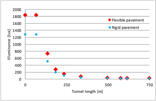 In the last years, in Italy, the increasing attention to energy-saving led to the use of the most performing lamps [18] and studying the impact of reflective road pavements on lighting consumption. Road agencies are substituting old and inefficient lighting HPS systems with more recent and better performing LED ones, and, in the last five years, about 50 km of new and rehabilitated tunnels were built with concrete pavements. However, the process is slow and expensive: The high installation cost of LED lamps discourages road agencies from substituting HPS lamps [18], and the vast majority of tunnels still have HPS lamps.