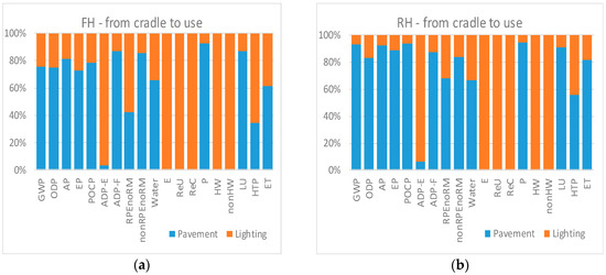 Figure 4a,b show the contributions of traffic and lighting to the “from cradle to use” phase calculated for FH and RH, respectively. The authors do not represent the results obtained for scenarios FL and RL because there are not graphically appreciable differences between cases which differ for lighting type.