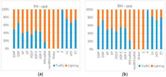 Figure 5a,b shows the contributions of traffic and lighting to the use phase impacts for FH and RH, respectively. The authors do not represent the results obtained for scenarios FL and RL because there are not graphically appreciable differences between cases which differ for lighting type.