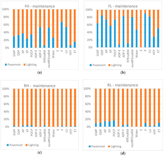 The construction phase has the lowest burden results: Its average percentage contribution is less than 10%. Regarding the maintenance phase, the obtained trend of pavement maintenance is interesting. In Figure 8, its incidence is appreciable only in FH and FL (red elements), while in RH and RL, it is not. It confirms the most onerous (and impacting) activities needed for managing road asphalt pavements.