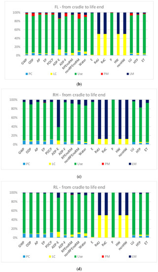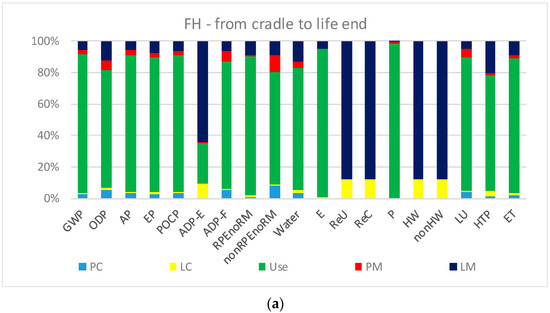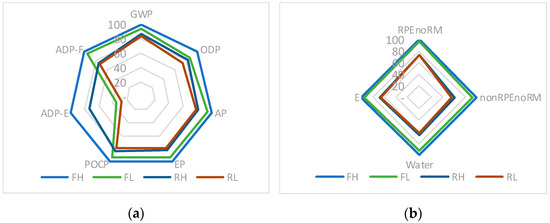 Comparison of “from cradle to use” impacts of (a) FH and (b) RH.