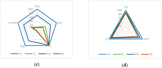 Therefore, the radar graphs in Figure 7a–d represent the adimensional obtained results of each IC attributing 100 to the value of FH. According to [30], each graph compares impact categories, which are grouped by similarities regarding their effects on the environment: Environmental impacts (Figure 7a); water, electricity, and primary energy consumption (Figure 7b); solid and powdery output flows (Figure 7c); and life quality ICs (Figure 7d).