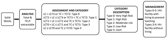 The regulation further compares total elemental analysis of the material against stipulated Total Concentration Thresholds (TCTs). The TC thresholds are divided into TCT0 (minimum threshold), TCT1, and TCT2 (maximum threshold). The TCT0 values were obtained from RSA Soil Screening Values that are protective of water resources, while TCT1 values were derived from the Land Remediation Values for Commercial/Industrial Land determined by the Department of Environmental Affairs’ “Framework for the Management of Contaminated Land”, of March 2010. TCT2 values were derived by multiplying TCT1 with a factor of 4 [32,33]. After the total and soluble data of the waste have been compared to the various TCT and LCT levels, the waste is classified as outlined in Table 2.
